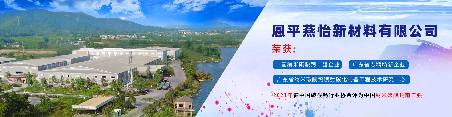恩平燕怡新材料有限公司成立于2006年,位于廣東省江門恩平市。是一家專注于納米碳酸鈣產(chǎn)品研發(fā)、生產(chǎn)以及銷售服務(wù)的新材料企業(yè)。 公司榮獲 “高新技術(shù)企業(yè)”、 “清潔生產(chǎn)企業(yè)”、“廣東省納米碳酸鈣噴射碳化制備工程技術(shù)研究中心” 、 “中國納米碳酸鈣十強企業(yè)” 、 “廣東省專精特新企業(yè)”等稱號,并通過ISO9001:2015質(zhì)量管理體系認證,產(chǎn)品質(zhì)量符合國家行業(yè)標準GB/T19590—2011納米碳酸鈣優(yōu)等品的要求。...